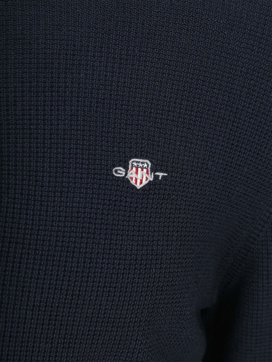 Met deze GANT trui & sweater in navy voeg je een klassieke half zip toe aan je garderobe. De ruim vallende regular-fit en micro textuur geven een verzorgde uitstraling zonder moeite. Biologisch katoen voelt zacht aan en draagt comfortabel op de huid. Katoen is ademend en helpt je temperatuur prettig te reguleren. Combineer met een GANT chino en een GANT overhemd voor een complete set.