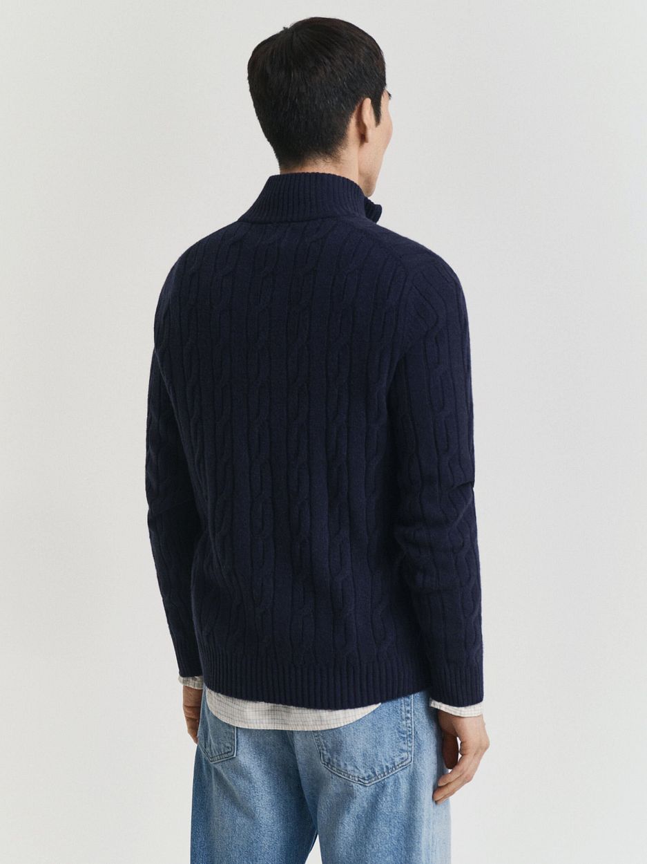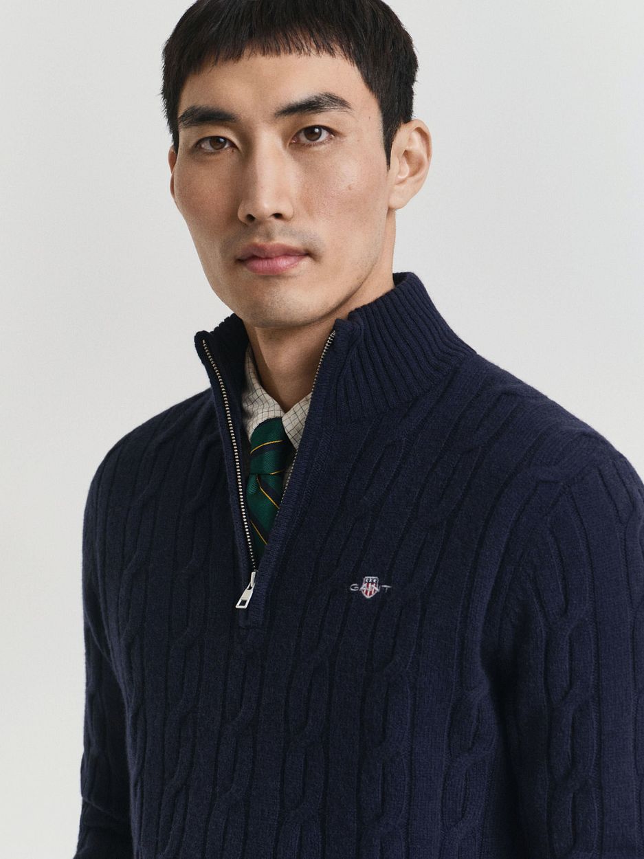 Verwen uzelf met de tijdloze elegantie van deze GANT Halfzip Lamswol Trui. Gemaakt van hoogwaardige lamswol zorgt deze trui voor warmte en comfort, perfect voor de frissere dagen. De cable knit en halfzippende schipperstrui voegen een klassieke touch toe aan uw look. Combineer deze trui met een chino en loafers voor een stijlvolle en sophisticated outfit.