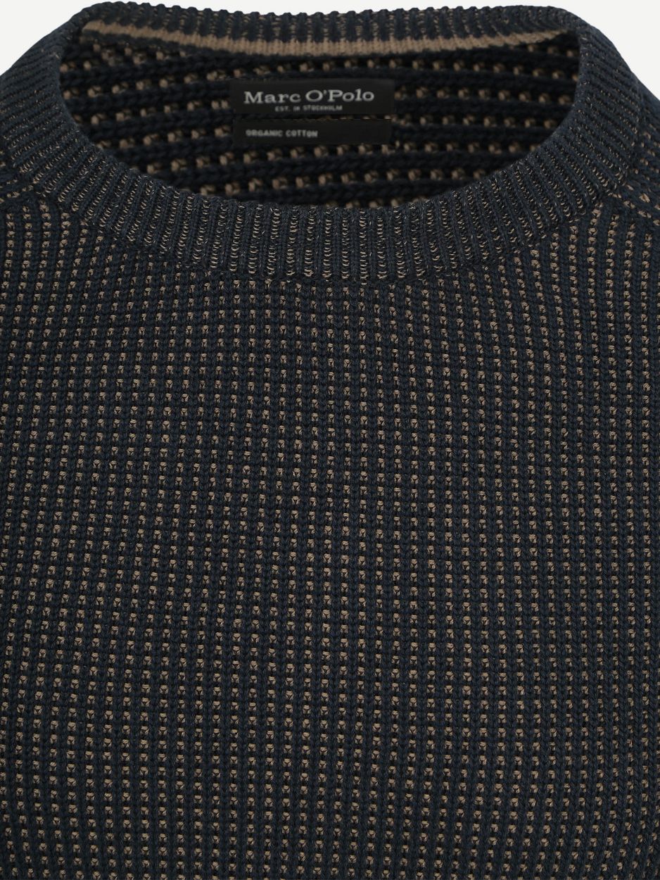 Marc O’Polo trui in navy met een gestructureerde bi-colour uitvoering en een klassieke O-hals. Je draagt hem in een ruime regular-fit die comfortabel valt en geschikt is voor een verzorgde, ontspannen uitstraling. Katoen voelt zacht aan op de huid en draagt prettig gedurende de dag. Katoen is goed ademend en helpt warmte op een natuurlijke manier te reguleren. Combineer met een Marc O’Polo chino en een bijpassend overshirt voor een complete set.