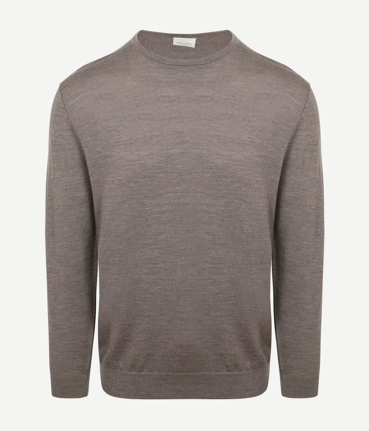 Ontdek de tijdloze klasse van deze taupe merinowollen pullover van Profuomo. Het luxueuze materiaal biedt ultiem comfort en een verfijnde uitstraling. De moderne pasvorm creëert een stijlvolle look die moeiteloos te combineren is. Ga voor een smart-casual outfit en draag deze pullover met een donkerblauwe chino en leren schoenen van Profuomo.