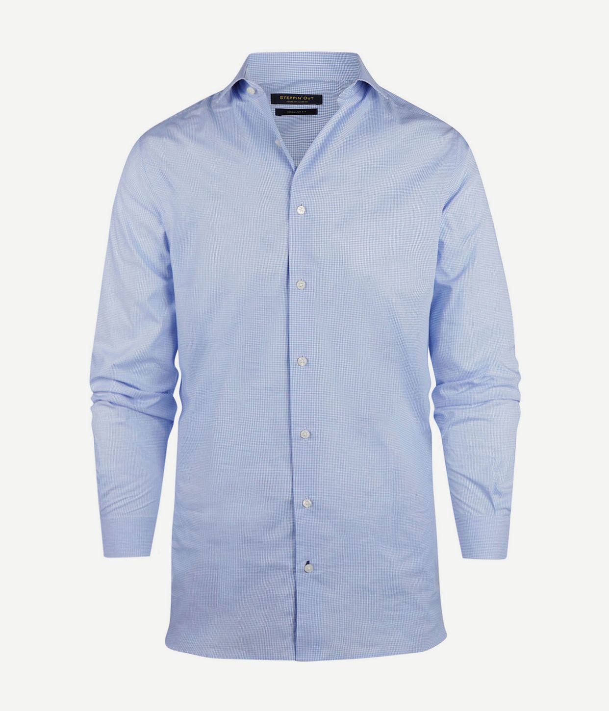Geniet van het comfort en de tijdloze elegantie van dit lichtblauwe geruite overhemd van Steppin' Out. De cut-away kraag geeft een vleugje distinctie aan je uitstraling. Dankzij het 100% katoenen stof is dit overhemd warmte- en vochtafvoerend, waardoor u zich de hele dag door comfortabel voelt. Daarnaast is katoen zeer sterk en duurzaam zodat het overhemd lang mooi blijft. De regular-fit pasvorm biedt een ideale balans tussen comfort en stijl, en maakt het gemakkelijk om te combineren met een variëteit aan broeken en jassen uit de Steppin' Out collectie.