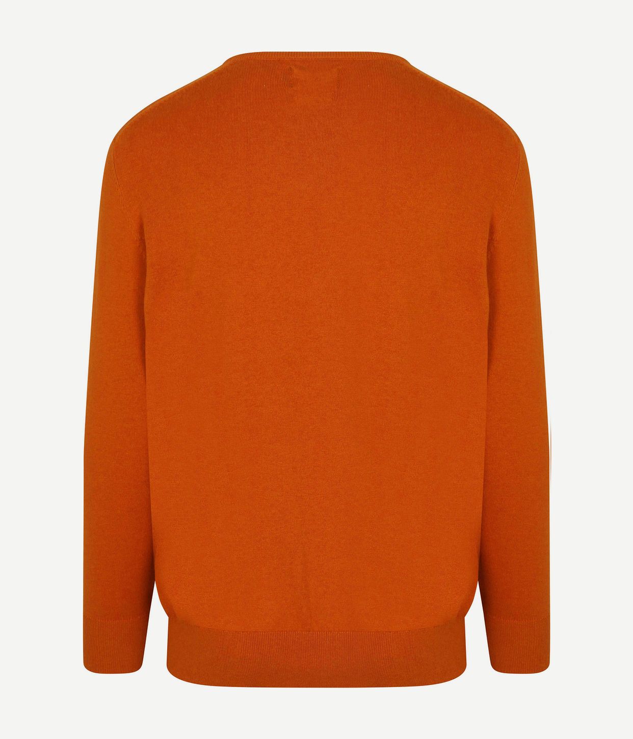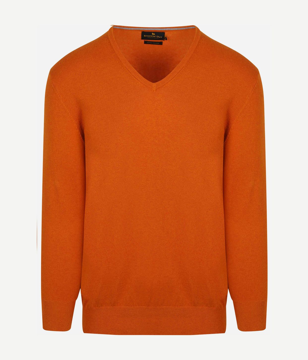 Steppin' Out vormt een elegant samenspel van comfort en stijl in deze oranje katoen-kasjmier trui. De trui valt op door zijn regular-fit en is ideaal voor chic of informeel dragen. U ervaart hoe soepel kasjmier samen met het natuurlijke katoen zorgt voor een buitengewone zachtheid en een uitstekende thermoregulatie. Deze trui is afgewerkt met een klassieke V-hals, een effen dessin en een ruime fitting die perfect past bij elke man. Kies Steppin' Out voor een tijdloze stijl en een ongeëvenaard draagcomfort.