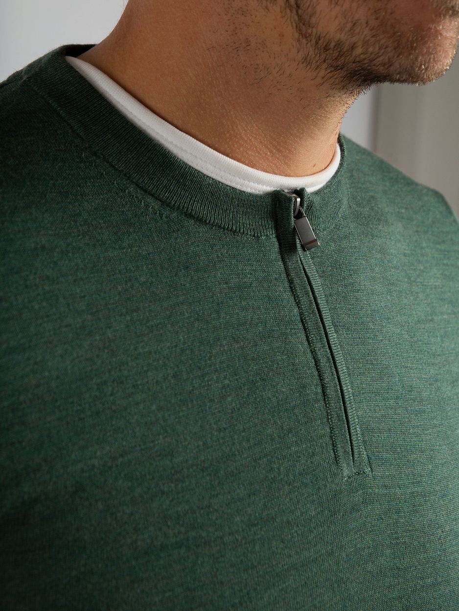 De Suitable Crew Zip Merino Groen is een stijlvolle en kwaliteitsvolle pullover van het merk Suitable. Deze trui is gemaakt van 100% Merino wol, wat zorgt voor een luxe uitstraling en een comfortabele pasvorm. De slim-fit en getailleerde vorm geven een moderne look. Combineer deze trui met een chino van Suitable voor een complete outfit.