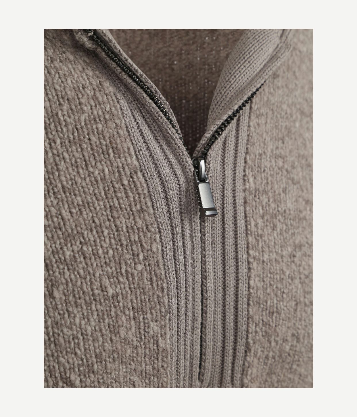 De Suitable Deep Zip Pullover in gekookte wol in taupe is een tijdloze schipperstrui die elke man in zijn garderobe moet hebben. Het hoogwaardige materiaal van wol, katoen en nylon zorgt voor comfort en duurzaamheid. De moderne pasvorm en het klassieke ontwerp maken het een veelzijdige keuze voor elke gelegenheid.