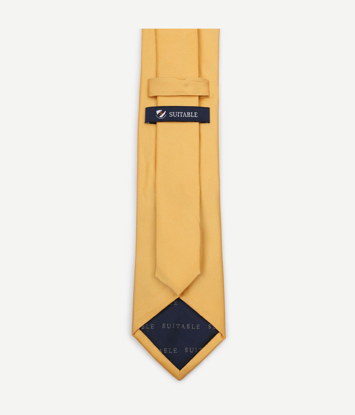 De gele zijden stropdas van Suitable is een tijdloos accessoire voor de klassieke heer. Gemaakt van 100% zijde met een breedte van 7,5 cm, straalt deze das elegantie en finesse uit. Het materiaal voelt zijdezacht aan en zorgt voor een luxueuze uitstraling. Combineer deze stropdas met een navy pak en wit overhemd voor een stijlvolle look. - Dessin: Effen - Samenstelling: 100% zijde - Afmetingen: 7,5 cm breed, lengte niet gespecificeerd